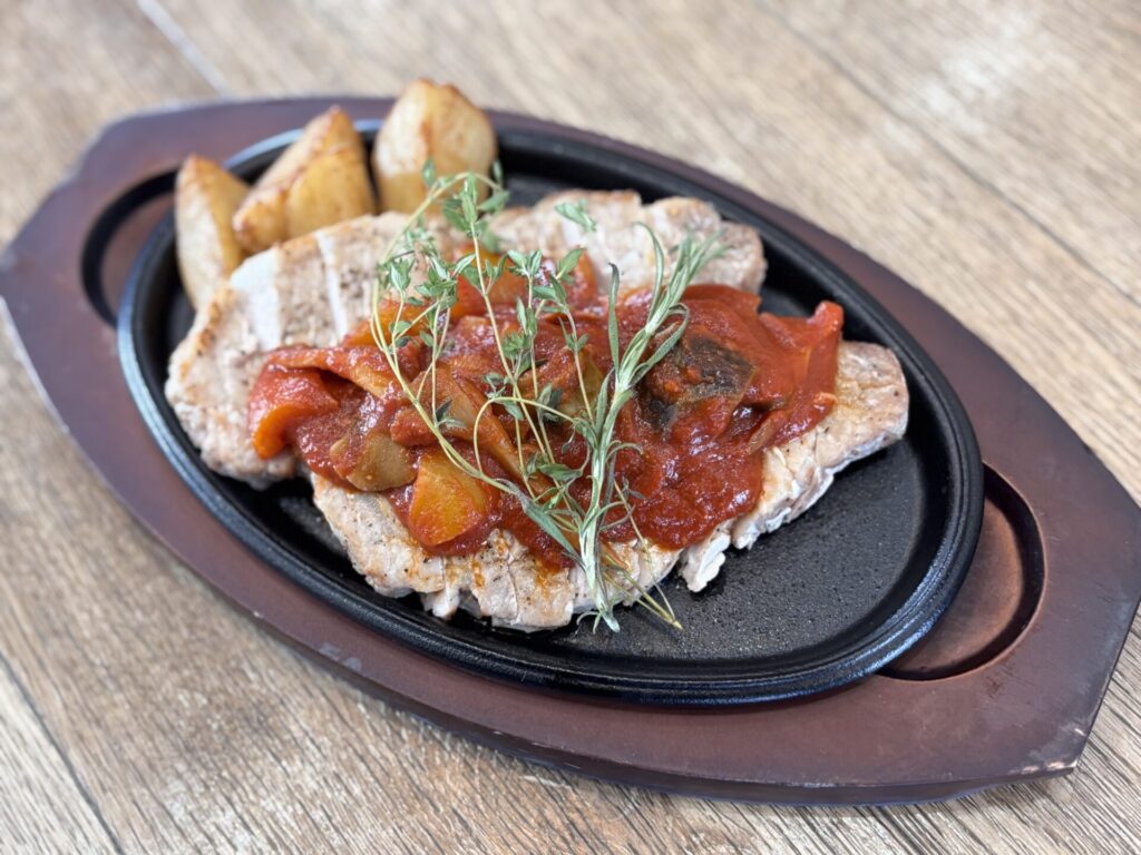 豚ロースのオーブン焼き 秋野菜とトマトの煮込みソースがけ(日替わり)