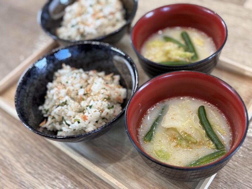 青菜と小エビの混ぜご飯/鶏白湯スープ酒粕風味