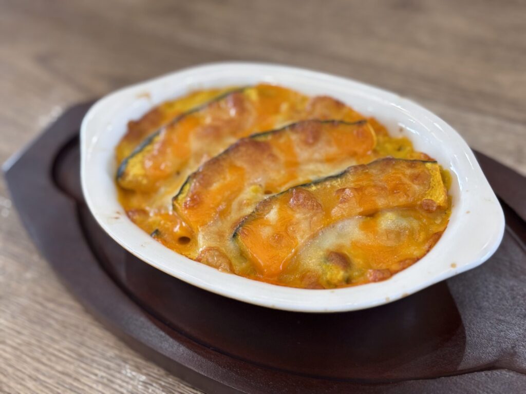 鶏ひき肉としめじとペンネのかぼちゃグラタン(日替わり)