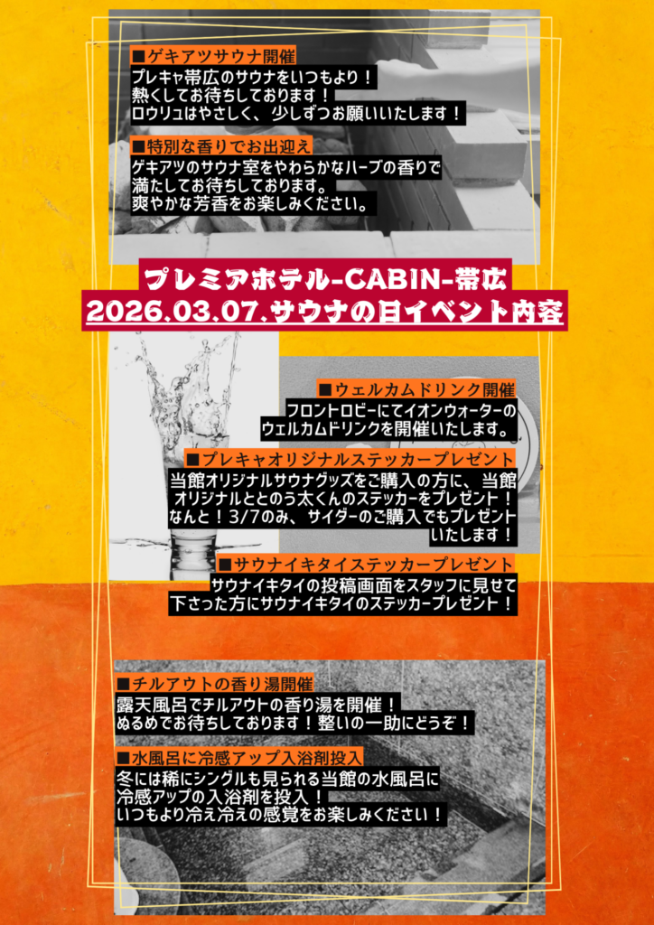 TOP ニュース 【3/7開催】イベント内容公開 2026年3月6日(金) イベント サウナ 【3/7開催】イベント内容公開 皆様こんにちは。 プレミアホテル-CABIN-帯広でございます。 お待たせしておりました、サウナの日のイベント内容を公開させていただきます。 ゲキアツサウナや冷え冷え水風呂など、ぜひご注目ください! 当日のご来館を、こころよりお待ちしております。 記事一覧 次の記事