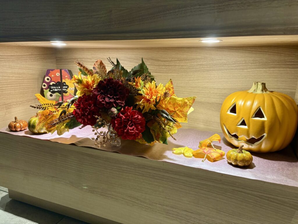 エレベーター前および朝食会場の棚にてハロウィンの雰囲気をお楽しみいただけますので、ぜひご覧くださいませ。
