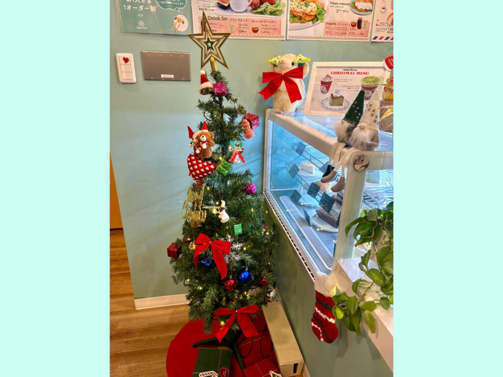 デザートケースの前にクスマスツリーや羊が飾られています。