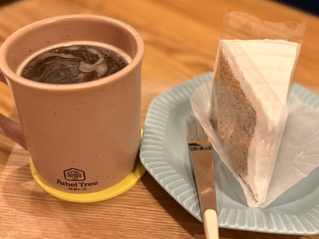 お店の名前はエゼルツリーコーヒーでございます。ドリンクメニューが豊富で、コーヒー以外のメニューもたくさんございました。その他デザートやトーストのメニューもあり、中にはヒツジが乗っているケーキもあるようです。