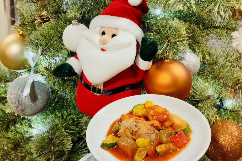 クリスマスチキン(彩り野菜のトマトソース掛け)